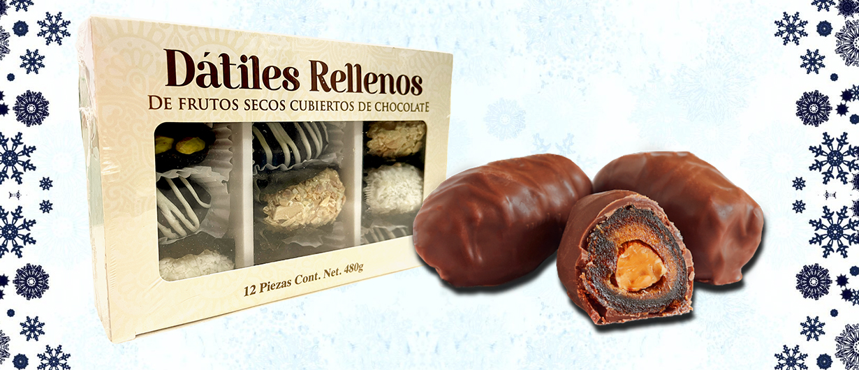 Una detalle delicioso y fino son los dátiles rellenos de frutos secos cubiertos de chocolate. Hay una gran variedad de sabores y posibilidades, tu mismo puedes armar tu caja con los que más te agraden.
